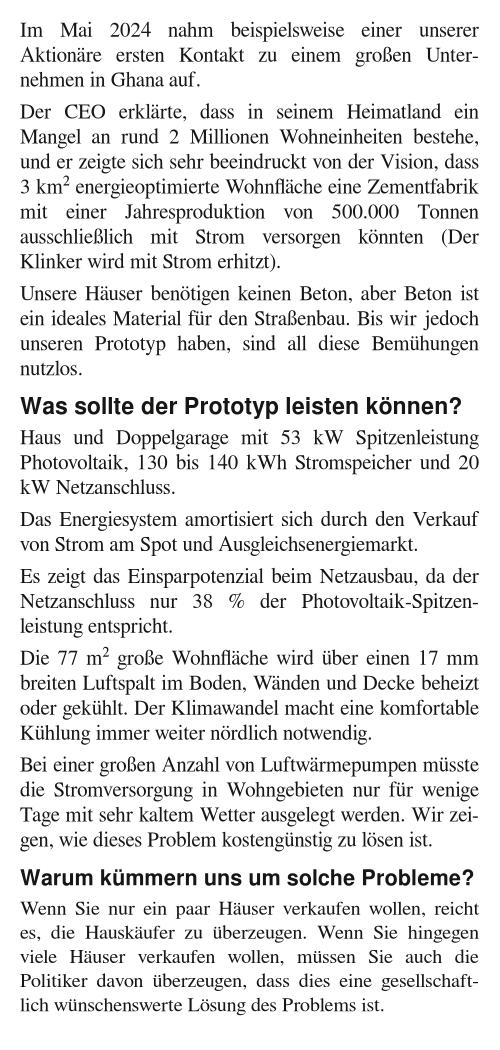 | Ziel für 2023 ist die Errichtung der ersten Werkshalle 2024 in Unken vorzubereiten und die restliche Entwicklungsarbeit an dem Haus und der Produktionstechnik. | |